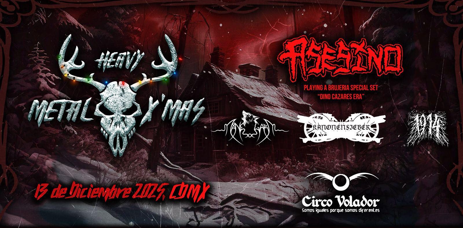 HEAVY METAL X´MAS 2025 será una congregación metalera que reunirá a exponentes de diversos estilos y nacionalidades, para realizar un aquelarre digno del cierre de actividades. Así que como sumo sacerdote fungirá DINO CAZARES y su pandilla de ASESINO, con quienes interpretará un set especial conformado por mucho material de la icónica era en la que formó parte de BRUJERIA; obviamente también sonarán muchas de las historias de Corridos de Muerte y Cristo Satánico. Como ya es costumbre, el «Asesino Mayor» vendrá acompañado por Maldito X (Tony Campos) y Sadístico (Emilio Márquez).