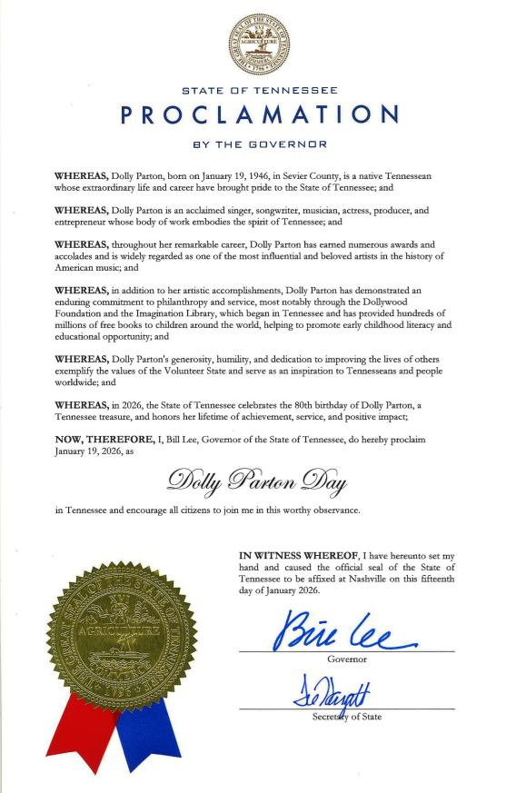 La proclamación reconoce los logros, el servicio y la influencia positiva de DOLLY PARTON durante toda su vida y alienta a todos los habitantes de Tennessee a unirse a esta celebración año con año.