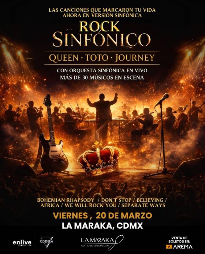 La grandeza del rock clásico, ese lenguaje musical que durante décadas ha acompañado la vida emocional de millones de personas, encontrará una nueva dimensión sonora el próximo viernes 20 de marzo, cuando el concepto Rock Sinfónico llegue al Centro de Espectáculos La Maraka de la Ciudad de México, en una velada concebida para reencontrarse con algunas de las canciones más emblemáticas de la historia del género bajo una perspectiva orquestal que promete estremecer a la audiencia. Los boletos ya se encuentran disponibles a través de la plataforma Arema.mx, así como en taquillas del inmueble.